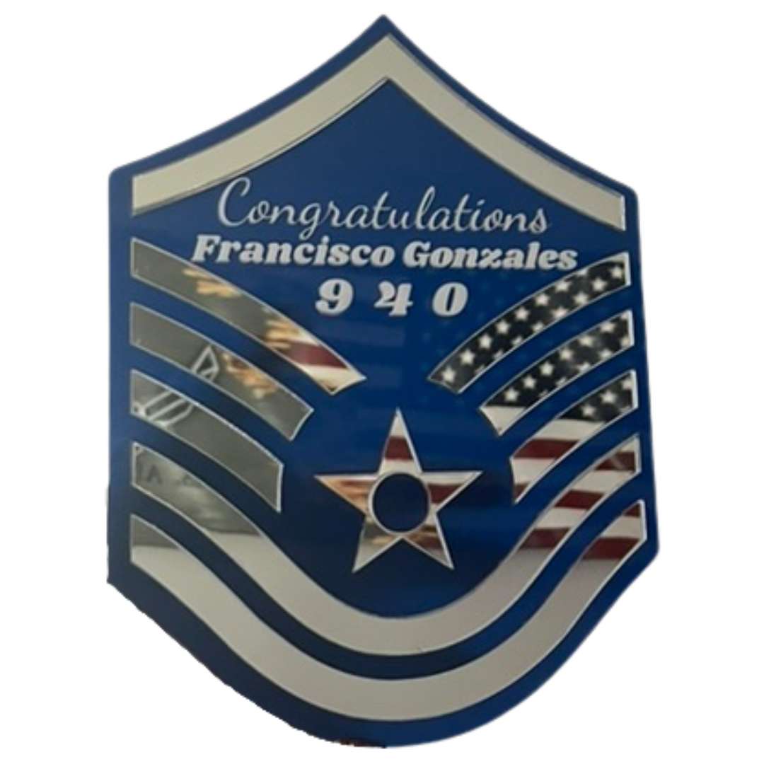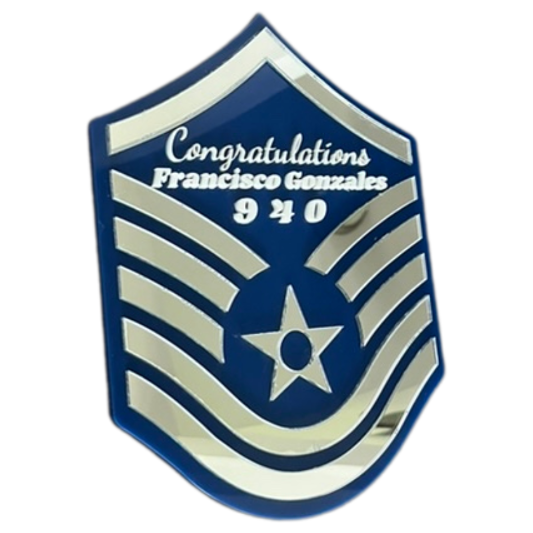 This custom plaque brings that meaning to life with polished mirrored acrylic stripes layered over bold Air Force blue and crisp white. It reflects not just your new rank, but the legacy you're building.